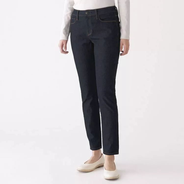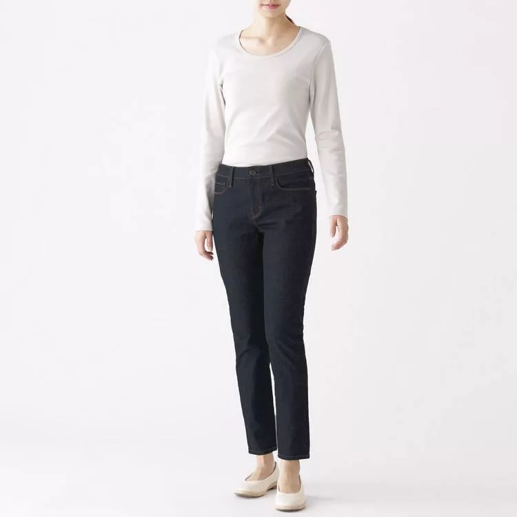 商品描述: [MUJI無印良品]女有機棉混縱橫彈性丹寧窄版九分褲暗藍